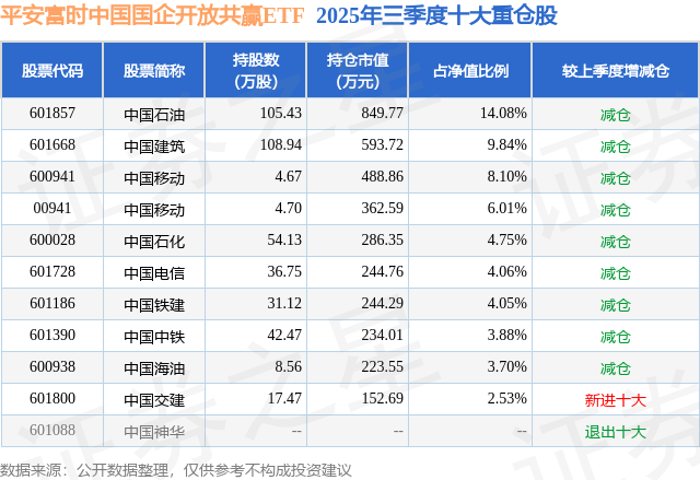 从基金规模来看,平安富时中国国企开放共赢ETF基金2025年三季度公布的基金规模为0.6亿元,较上一期规模9399.52万元变化了-3365.47万元,环比变化了-35.8%。该基金最新一期资产配置为:股票占净值比98.31%,无债券类资产,现金占净值比1.24%。从基金持仓来看,该基金当季前十大股票仓位达61.0%,第一大重仓股为中国石油(601857),持仓占比为14.08%。